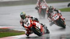 Bayliss imprendibile! Sulla pista bagnata il fuoriclasse australiano della Ducati è scattato perfettamente dalla pole position guidando la corsa dall’inizio alla fine. La sua 37° vittoria iridata non è stata però affatto agevole perché alle sue spalle Troy Corser e Noriyuki Haga si sono scatenati con le loro Yamaha YZF-R1. I tre di testa sono rimasti vicinissimi ma Bayliss non ha mai permesso agli inseguitori di tentare il sorpasso. Nella prima parte Corser ha tenuto a bada Haga che però nel finale ha passato il compagno accorciando ulteriormente le distanze da Toseland.