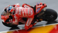 Stoner ha conquistato il miglior crono nella fase iniziale del turno di prove ufficiali, con la pista bagnata, ma senza pioggia. Secondo, ottimo, Chris Vermeulen sulla Suzuki. Poi le nuvole hanno ricominiciato a tirar giù un sacco di acqua e per tutti la possibilit di miliorare è scemata.