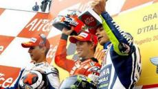 Stoner conquista il Mugello. Prima vittoria Ducati sul circuito di casa. Lorenzo secondo dopo un avvio difficile. Rossi terzo consola migliaia di tifosi accorsi sotto il podio.