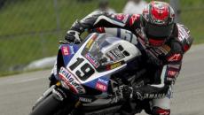 Gara 1. Dopo la Superpole ottenuta ieri con un pizzico di aiuto da parte della pioggia, che ha interrotto le qualifiche anzitempo, Ben Spies dà libero sfogo al suo talento senza alcuna riserva. Il passo di gara da lui mostrato nel warm-up della mattina è impressionante: quasi un secondo lo separa da tutti gli altri. Al via di Gara 1 il cielo è ancora coperto ma la temperatura dell’asfalto è già più alta che nel resto del weekend. Si spengono i semafori. Spies scatta al comando e prova da subito ad andar via, seguito da Biaggi e Haga che parte bene dalla seconda fila. Max deve prima resistere agli attacchi di Noriyuki, che cerca di infilarlo incrociandone le traiettorie, poi è libero di inseguire il texano e di fotocopiarne i tempi per qualche giro. Al quinto passaggio fanno segnare entrambi il crono di 1’30.6. Haga non ne ha abbastanza per stare coi due là davanti e perde decimi ad ogni passaggio, riesce però ad amministrare la gara, tenendosi isolato in terza posizione, quanto basta per non essere impensierito dal gruppo degli inseguitori capitanato da Shane Byrne. Il campione della Superbike britannica deve tenere a bada l’aggressività del connazionale Leon Haslam disposto a tutto pur di ben figurare sul circuito di casa. Nakano, in sesta piazza, completa l’ottimo risultato dell’Aprilia; Tom Sykes, il terzo inglese del quartetto, è alle calcagna del giapponese, ma centra una piccola buca del vecchio e insidioso asfalto di Donington: lo sterzo della sua Yamaha R1 si chiude; dopo la caduta riesce a risalire in moto ma decide comunque di ritirarsi. Rea, uno dei favoriti prima della gara, è ancora più staccato in ottava posizione, dietro di lui c’è Michel Fabrizio che naviga in cattive acque: la sua 1198 ha un problema alla leva del cambio e gli impedisce di inserire la prima marcia, così è costretto a percorrere i lenti tornanti della parte finale del tracciato con la seconda, finendo sempre un po’ lungo e perdendo posizioni fino a scivolare in dodicesima. Davanti a tutti Max Biaggi fa volare la sua RSV4 che si esprime sempre meglio via via che il sole riscalda l’asfalto: continua a rosicchiare decimi di secondo a un Ben Spies più che disposto a forzare un po’ l’andatura pur di non farsi raggiungere. La guida di Max è più pulita e sebbene paghi qualche decimo sui lunghi curvoni veloci in discesa, sa essere più efficace nel seguente tratto misto in salita. A metà gara Biaggi ha già raggiunto il campione americano ed innesca con lui una sfida a viaggiare sulla soglia dell’ 1’30 alto. Le gomme cominciano a consumarsi ed a perdere aderenza. Il ritmo di gara si alza di quasi un secondo, Biaggi riesce a tenere l’1’31 e mezzo, viaggia incollato ai tubi di scarico del texano e lo forza ad impostare un ritmo di 1’31.1 ed a prendersi non pochi rischi. Ma il campione romano non molla, gira un paio di decimi più veloce e gli si riporta sotto. Spies ha un minimo di margine ancora a disposizione e se lo gioca tutto al penultimo giro percorrendolo in 1’30.9, e va ad iniziare l’ultimo passaggio con sei decimi di vantaggio. Biaggi può solo sperare di stargli dietro e tentare un arrivo in volata ma all’uscita del penultimo tornante prima del traguardo la sua Aprilia si spegne e Max è costretto a scuoterne il serbatoio per far affluire le ultime gocce di benzina che gli consentano di chiudere comunque secondo. Ben “Texas Terror” Spies vince anche sul circuito di Donington e porta a casa punti pesanti. Haga deve accontentarsi del terzo posto ed abituarsi ad interpretare le gare tenendo sempre un occhio puntato sulla classifica piloti per gestire il proprio, ormai esiguo, vantaggio.
