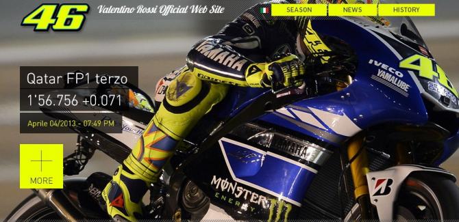 Mentre la stagione 2013 della MotoGP prende il via con le prove libere del decimo GP del Qatar con Valentino Rossi tornato nelle posizioni di vertice a lui consone, il suo staff ha messo online la versione completamente rinnovata del suo sito ufficiale www.valentinorossi.com. Più che un sito, la nuova vetrina web del "Dottore" è un portale multilingua che offre l'accesso ai seguitissimi profili "social" di Rossi, come Twitter, Instagram e Facebook. Su quest'ultimo social network appena due settimane fa è stata lanciata la prima pagina ufficiale di Valentino Rossi, mentre sul suo canale YouTube si possono gustare interviste, gare e filmati inediti realizzati al "Motor Ranch" del campionissimo di Tavullia.