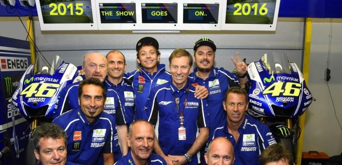 Correrà ai massimi livelli almeno fino a 37 anni Valentino Rossi, che insieme al team Yamaha Movistar MotoGP ha annunciato l'estensione dell'accordo che lo lega alla Casa dei Tre Diapason anche per le stagioni 2015 e 2016 della classe regina. Il rinnovo di Yamaha con il nove volte campione del mondo corona l'ottima stagione del talento di Tavullia, che ad oggi occupa la seconda posizione in classifica piloti a pari punti con Dani Pedrosa, in virtù di quattro secondi posti e cinque podi in totale negli otto Gran Premi sinora disputati.